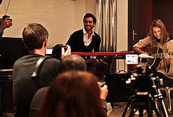Arrive le moment tant attendu du showcase. C'est un peu étrange comme situation. Prenez deux artistes.Installez les dans un cadre qui peut sembler familier : un salon confortable, avec feu de cheminée. Demandez leur de jouer quelques uns de leurs titres (dont bien sûr des nouveautés de l'album à paraitre le 25 octobre) comme s'ils étaient chez eux, juste tous les deux. Sauf qu'il y a sur place deux équipes pour les filmer et qu'en dehors du staff habituel (management, maison de disque...) il y a aussi quelques fans vainqueurs du concours lancé sur leur page FB et un lot de blogueurs, bardés de bonnes intentions à leur égard. Pas évident de faire-comme-si on était tranquille au calme chez soi. Pourtant Morgane et Mark s'en sortent bien. Visiblement détendus, ils plaisantent et se lancent dans l'aventure, souriants.