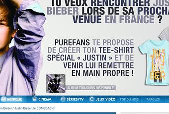 Tu veux rencontrer Justin Bieber lors de sa prochaine venue en France à la fin de l'année 2010 (on vous donnera la date exacte prochainement) ... Purefans te propose de créer ton tee-shirt spécial "Justin" et de venir lui remettre en main propre.