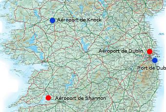 Carte des ports et aéroports d'arrivée en Irlande