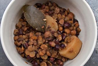 300 g de mélange minestrone / 50 g de lentilles corail / 50 g de pois cassés / 50 g de lentilles béluga / 3 pommes de terre / deux oignons frais, 1 blanc, 1 violet / une vieille croûte de parmesan / 1 bouillon de légumes bio / gros sel / huile d'olive / 30 g de sucre roux / graines de coriandre / anis étoilé / poivre de sishuan / feuilles de laurierFaire revenir dans un faitout les oignons dans de l'huile d'olive avec les épices, puis ajouter le sucre, et les légumes secs. Recouvrir de bouillon de légume chaud, puis ajouter les pommes de terre, les feuilles de laurier et la croûte de parmesan qui parfumera la soupe. Laisser mijoter deux bonnes heures et manger très chaud.