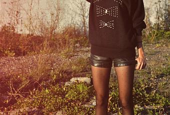 Ariane et le pull vintage Polly Pocket agencé de ses propres vêtements vintage: un foulard vintage léopard rouge porté en bandeau, shorts équestres de cuir des 50s, collants American Apparel et chaussures vintage Galliano en velours.
