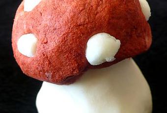 Mélanger les poudres entre elles (attention, le port d'un masque est plus que conseillé, le SCI étant très pulvérulent !). Faire fondre au bain marie le beurre avec la vitamine E. Incorporer le gélisucre au beurre, puis la fragrance, et verser le tout sur les poudres. Bien mélanger jusqu'à obtenir une pâte malléable. Modeler le pied du champignon. Réserver un peu de pâte blanche, puis colorer le reste de la pâte avec l'oxyde. Modeler le chapeau du champignon et le coller sur le pied. Bien se laver les mains, puis former des petites boules blanches, à incruster ensuite sur le chapeau du champignon.