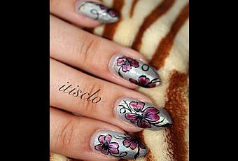 Un vieux nail art mais que j'aime vraiment bien ! J'adore les fleurs et je trouve que l'association du gris et du rose rend vraiment bien sur un ongle taillé en pointe pour l'occasion!