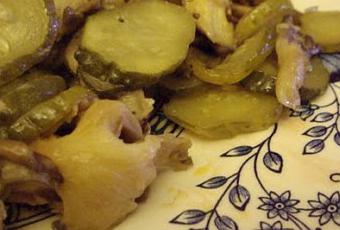 Émincez l'échalote et les concombres/cornichons. Déchirez à la main les pleurotes. Faites revenir le tout dans un peu d'huile de sésame, rajoutez le gingembre, un peu de sel, attendez que les pleurotes deviennent tendres et rajoutez le shoyu.