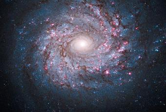 Sur cette image composite réalisée dans le visible et l’infrarouge, on ne peut qu’admirer la structure spiralée où se bousculent des dizaines de milliards d’étoiles et une multitude de nuages moléculaires. Ces derniers sont des nébuleuses enfouies dans les enroulements. Elles apparaissent telles des petits flocons de gaz rouges et roses, éparpillés dans les bras spiraux. Agités par les forces de marées, les bousculades de matières ou encore secoués par les explosions d’étoiles massives, plusieurs milliers d’étoiles sont en gestation parmi d’autres réunies en grappes. La nuée jaune pâle au centre est le bulbe galactique, boursouflure ovoïde qui concentre les étoiles les plus âgées de la galaxie.