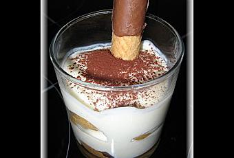 Pour 4 personnes, il vous faut: 20 cl de café 1/2 cuillère à café d'arôme de noisette 100 gr de mascarpone 50 gr de crème fraîche épaisse 100 gr de ricotta 80 gr de sucre en poudre 2 sachets de sucre vanillé 1 gousse de vanille 24 biscuits à la cuiller Cacao en poudre