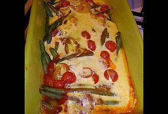 Étalez les haricots verts dans le plat à gratin. Recouvrir de la sauce tomate. Saler, poivrez et arrosez d'huile d'olive. Enfournez 30 minutes (180°C), jusqu'à ce que la tomate soit légèrement confite.Fouetter le yaourt et l'œuf. Assaisonnez et ajouter le paprika. Versez cette crème sur les haricots verts et remettre au four 10 à 15 minutes à 180°C.