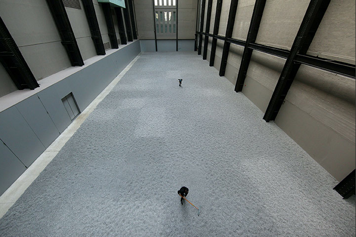 Nouvelle installation de Ai Weiwei présentée dans le Hall de la Tate Modern, un parterre de 1000 mètres carrés. Cent millions de graines de tournesol en porcelaine, petits objets précieux fabriqués et peints à la main par 1600 ouvriers (ouvrières surtout) d’une petite ville chinoise, Jingdezhen, capitale de la céramique. Source:LeMonde -Les lunettes rouges, Tate Modern