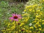 Dans notre jardin potager, un peu floral, poussent trois fleurs un peu "extra-ordinaire". Au premier plan, une belle toute jeune échinacée pourpre, une camomille exubérante et un millepertuis très solaire.