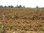 Voici une photo des petits plants de vigne tout juste décavaillonnés. Ce travail consiste à sortir la terre que se trouve dans l'axe du rang de vigne. Ainsi, nous pouvons lutter contre une présence trop importante des herbes, indésirables au bon développement des petits plants.
