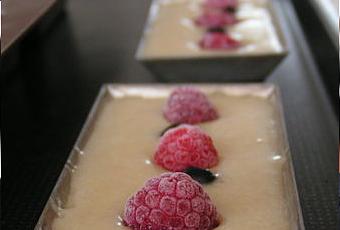 5- Mettre la préparation dans des moules en silicone individuel (pas besoin de beurrer), si vous utiliser des moules classiques les beurrer généreusement, ajouter sur la préparation quelques framboises et myrtilles