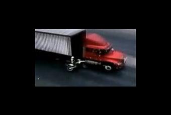 Sonia Nalvarte, une femme agent de police à moto de la police péruvienne à heurté violemment un semi-remorque et à presque fini sous les roues du camion.
