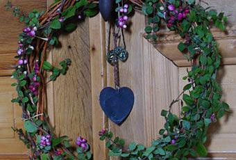 Des branches d'osier ont été assemblées et attachées avec du raphia pour former la couronne. Des branches de cotoneaster avec son feuillage vert et ses fleurs roses sont fixées sur la couronne. Côté idées, cliquez sur cette autre couronne à réaliser.