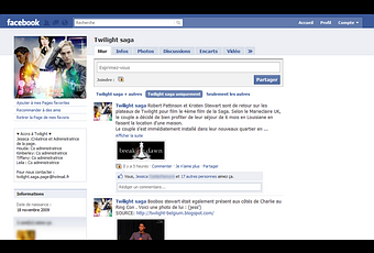 Un nouveau partenariat sur twilight vef france ! La Page facebook "Twilight saga" qui compte actuellement 10 332 fans ! Cette page très souvent actualisée est tenue par Jessica, et plusieurs autres co-administratrice, il faut absolument être abonné à cette superbe page ! Et pour l'occasion des 1 an du site, elle nous a accordé une interview ! Vous pourrez la découvrir en Novembre !