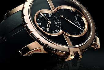 Or rouge du boîtier, d’abord, mais aussi du rehaut tridimensionnel ceinturant les deux compteurs de ce modèle aux superbes lignes masculines. Or rouge de la lunette cannelée au dessin résolument affirmé, des plaquettes rapportées, des cornes ajourées, des aiguilles et de la boucle déployante, dont l’éclat contraste avec le mat sombre du caoutchouc, celui du bracelet, du cadran et de la couronne. Un équilibre étudié pour ce garde-temps qui pousse le détail jusqu’à la pointe de ses aiguilles en Super-LumiNova.