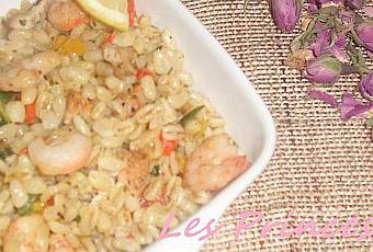 Dans une casserole mettre l'huile à chauffer, ajoutez l'ail haché et laissez revenir 2 minutes puis ajoutez les poivrons coupés en dés, les courgettes en dés. Salez et poivrez laissez cuire pendant 5 minues (il faut laisser AL DENTE à l'talienne ), à ce moment ajoutez les crevettes et laissz pour 3 minutes, ajouter le blé avec une petite louche du bouillon et laisser jusqu'à absorption complète de bouillon en remuant de temps en temps ajouter le persil.