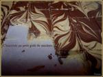 Tapisser un moule rectangulaire de papier sulfurisé et déposer en alternance des cuillerées de chocolat blanc et de chocolat noir dans le moule. Secouer doucement pour étaler le mélange et passer une pointe de couteau dans un sens puis dans l'autre plusieurs fois de suite pour donner un effet marbré. Il est important de faire un maximum de marbrures car la texture des 2 masses est différente.