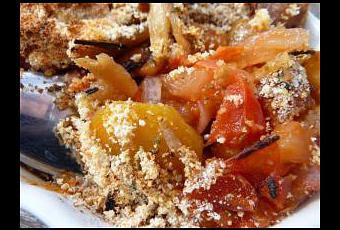Préchauffer le four à 220° (th 7), dans un plat à gratin, déposer les restes de carottes, les tomates et parsemer de crumble au parmesan.