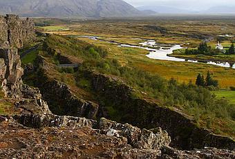 D'abord, Þingvellir. Imaginez qu'on voit ici, sur la même photo, la faille séparant les plaques tectoniques américaines et européennes, et, le site sur lequel a pris naissance le premier parlement de l'humanité... en l'an 930!