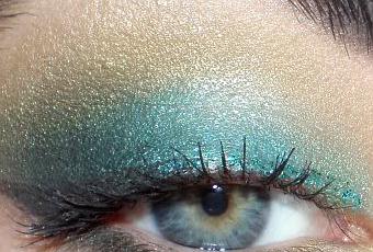 - Fards MAC Lucky Green (creux), Plumage (externe), Gorgeous Gold (sous la TL), Femme-Fi (TL)