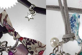 Réalisation d’un sautoir sur lien en daim ( divers coloris aux choix), agrémenté de perles et breloques et réhaussé d’une touche de Liberty.