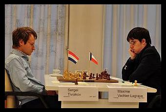 Ci-contre, le Français Maxime-Vachier Lagrave prenant le point entier ronde 3 avec les Noirs face à Sergei Tiviakov © Site officiel