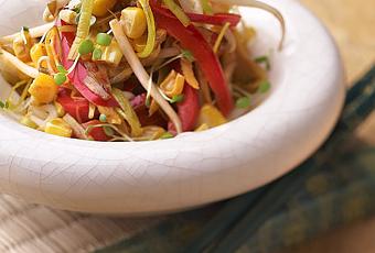 Émincer le poivron en lanières, le gingembre en julienne et les poireaux en fines rondelles. Les faire sauter au wok avec un peu d’huile pendant 3 à 4 minutes puis ajouter le maïs. Poursuivre la cuisson pendant 2 ou 3 minutes. Ajouter le soja puis la sauce soja. Faire cuire pendant encore 1 minute. Couvrir et laisser reposer pendant 2 minutes. Ajouter les graines germées et servir aussitôt.