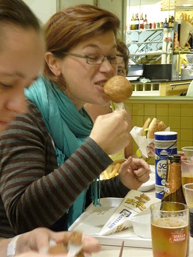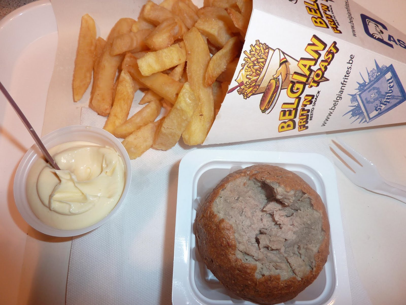 Et croyez-moi encore (ou toujours pas), je ne pense pas du tout à "ça" (voir le truc marron ci-contre) !Comprenant qu'il était temps d'éponger notre apéro bière au Delirium Tremens et que, quoi qu'il arrive, elle ne couperait pas à une dégustation de frites belges, Cynthia nous avait emmenées au Belgian Frit'n Toast, un snack (un Fritkot comme on dit de l'autre côté du Thalys), aussi central que réputé dont le site internet m'apprend qu'il fut le principal sponsor de l'élection de Miss Bruxelles 2009.