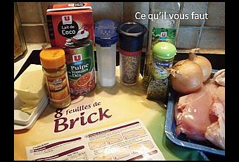 . Dans une grande poêle, versez l’huile, le poulet coupé en morceaux, les oignons émincés, l’ail pressé, la ½ boite de pulpe de tomates en dés, le curry et le lait de coco.