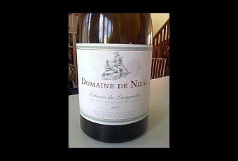 Coteaux du Languedoc, Domaine Nizas 2007 : Un nez séduisant de fruit noir mûr, typé mûre, cerise burlat, note de noyau, un fond léger chocolat cacao, et une pointe de fraicheur épicée mentholée. Au réchauffement, des notyes plus alcooleuse se font présnetes. La bouche est charpentée, large à l'attaque, puis structure droite, tonique, un style puissant, sudiste avec des tanins ronds plutôt précis, sur le fruit noir, le noyau. La finale, un peu marquée alcool chauffe un poil, et s'impose en puissance mais montre aussi sa jeunesse, sur le fruit noir, le noyau et fond léger amer cacao. Assez classique aromatiquement du Languedoc, le vin est puissant en gardant des tanins civilisés et une joli fraicheur tonique. Belle structure, beau travail mais dégusté trop jeune, il lui manque un peu de complexité et d'"affinage". La fiche indique prêt à boire aujourd'hui, apogée à 5 ans, je dirai plutôt attendre 3 ans et effectivement apogée 5 à 10 ans. Le vin était meilleur le lendemain après 24H00 d'aération. Très Bien 86-88
