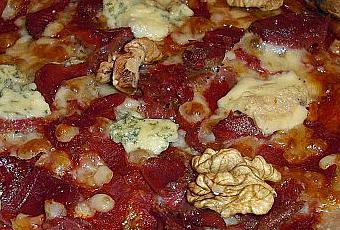 Ajouter le fromage à pizza, les gésiers (cuisson 30s au micro ondes super pratique !) et les dés de bleu d'Auvergne. Déposer quelques cerneaux de noix.