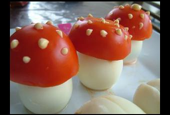 Couper la tomate en 2 dans le sens de largeur et les évider de maniere a pouvoir les poser sur les oeufs en guise de chapeau. Scotchez le chapeau à l’aide d’un peu de mayonnaise (si elle n’est pas trop liquide)