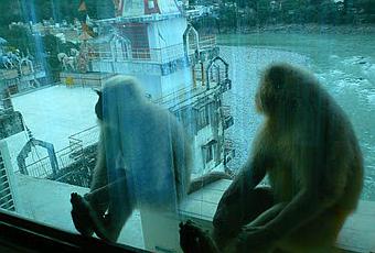 Ce matin, surprise de voir devant la fenêtre de la salle de bains de l'hôtel, deux visiteurs fort curieux et confortablement installés sur un large rebord donnant sur le Gange qu'on peut apercevoir en arrière-plan. Pas gênées du tout les bestioles et bien décidées à profiter du spectacle !Mais cela permet de voir la vue splendide de ma salle de bains, donnant sur un coude du Gange qui descend vers Rishikesh, et sur un joli petit temple qui jouxte l'hôtel et où chaque visiteur fait sonner une belle cloche...