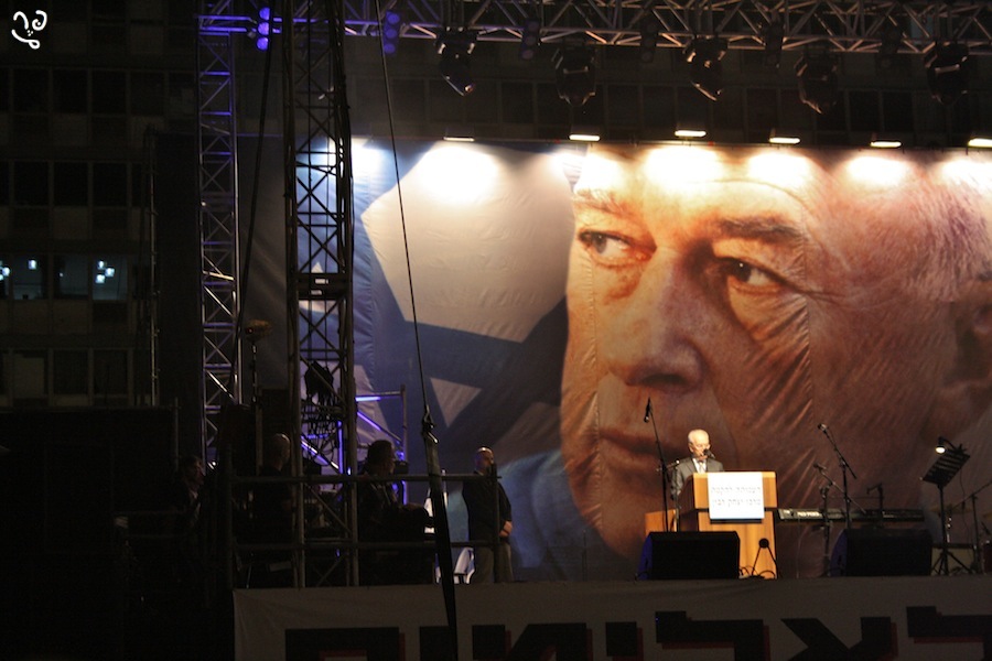 Shimon Peres parle à une foule très jeune, assemblée sous les panneaux des organisations de gauche et des mouvements de jeunesses socialistes.Comme chaque année, les gens se rendaient samedi au même endroit, serrés devant une scène où les discours se succèdent et continuent, encore et encore, se gargarisent de formules politiques, attaquent les gouvernements, fustigent l'indifférence, transforment et s'approprient chacun à leur tour l'héritage d'un homme devenu symbole. Avant c'était la Place des Rois d'Israël. Désormais on l'appelle Place Rabin.