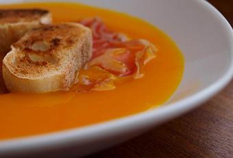 Poser dessus quelques copeaux de coppa et des rondelles de pain grillé.