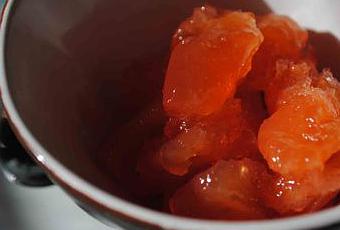 Cook in a saucepan on a low heat and let it boil gently until the fruits tunr into a nice orange color.
