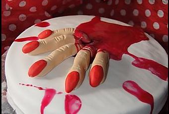 Dans un petit saladier mélanger le sirop de glucose avec le colorant alimentaire rouge pour obtenir du "sang" et le faire couler sur les doigts et les bords du gâteau !