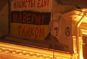Le 4 novembre, jour de l'unité nationale en Russie, est traditionnellement célébré par les nationalistes par des défilés. Le groupe d'artistes Аффинити (Affiniti), le groupe Верхотура и друзья (Sommet et amis) et les anarchistes de Saint-Pétersbourg ont souhaité une joyeuse fête aux "fascistes, nazis, patriotes, eurasiens, néoconservateurs", en leur préparant un cadeau spécial : une fresque. Peinte sur le mur d'un bâtiment de la Prospekt Nevski, la peinture dévoile un de leurs "secrets", sur un fond blanc-noir-or (leurs couleurs) : "Les nazis mangent des khebabs en secret".