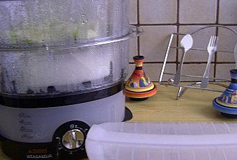Dans le cuit vapeur :du riz basmati nature et des courgettes salées .