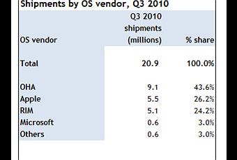 Les derniers chiffres publiés par Canalys, un expert en analyse de l'industrie high-tech, pour le troisième trimestre (Q3) affichent une très bonne santé des ventes d'Android sur le marché américain (US), des ventes qui ont été multipliées par 1309% passant de 3% au Q3 2009 à 43% au Q3 2010. Android se positionne alors comme le 1 système d'exploitation pour mobile.