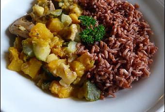 - Ajuster l’assaisonnement et servir avec du riz rouge complet.