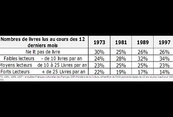 La proportion de forts lecteurs (25 livres et plus par an) continue à diminuer dans la société française, depuis le début des années 70, notamment dans les jeunes générations. Ce qui se traduit par une une augmentation de la quantité de faibles (1 à 9 livres par an) et de moyens (10 à 24 livres par an) lecteurs.