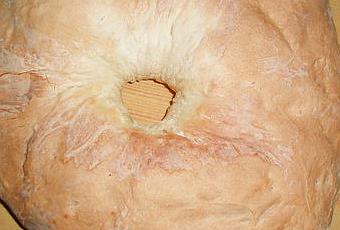 A la fin du programme sortir le pâton sur un plan de travail fariné, façonner le pâton en une grosse boule, puis creuser avec vos doigts un trou au centre, l'élargir jusqu'à ce qu'il fasse environ 10 centimètres de diamètre. Poser le sur une plaque de pâtisserie recouverte de papier sulfurisé, poser au centre de celui un petit récipient du même diamètre que le trou, et légèrement graissé.
