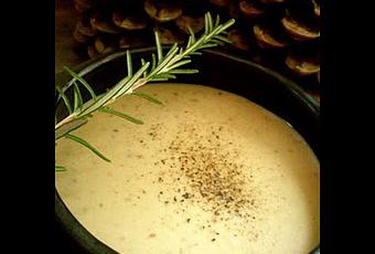 Peler l'oignon puis l'émincer finement. Chauffer la graisse de canard dans une cocotte puis y ajouter les oignons afin de les faire suer. Ils doivent devenir translucides sans colorer. Pendant ce temps, nettoyer les cèpes à l'aide d'une petite brosse et d'un chiffon propre puis les couper en morceaux. Ajouter l'ail, le thym, la feuille de laurier et les cèpes dans la cocotte et les faire revenir. Lorsque les cèpes ont rendu leur eau de végétation, ajouter l'eau et le lait puis chauffer un quart d'heure. Ajouter le foie gras, mixer, assaisonner puis dresser avant de déguster.