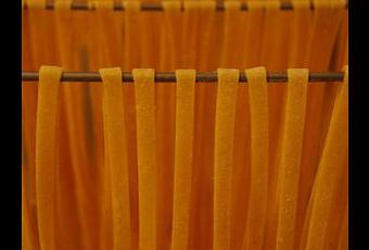 Au bout d'une ou deux heures, quand les tagliatelles ont commencées à sécher mais qu'elles ne collent plus, les enlever de l'étendoir et les placer dans un saladier pour qu'elles finissent de sécher. Ne surtout pas les laisser sécher complètement sur l'étendoir car elles finiraient par se casser au niveau du pli.