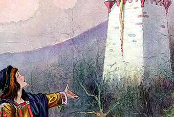 Pour des raisons obscures, l'homme est contraint d'accepter et la sorcière récupère le nourrisson comme convenu. Et lui donne le nom de Rapunzel/Raiponce, comme vous l'aviez deviné, grands garçons et grandes filles que vous êtes. L'enfant grandit et possède de longs cheveux dorés qu'elle noue en deux tresses longues et soyeuses. Quand la jeune fille a douze ans, la sorcière l'enferme dans un tour. La sorcière descend de la tour par ce truchement et commande la remontée en appelant «Raiponce, Raiponce, descends-moi tes longs cheveux...»