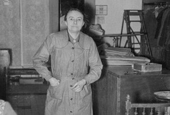 La vendeuse, en blouse de travail ne fait pas, avouons-le, assaut d'élégance. Ses instruments de travail sont le double-mètre, les grands ciseaux, l'escabeau pour accéder aux étagères hautes et, bien sûr le tiroir-caisse en bois.