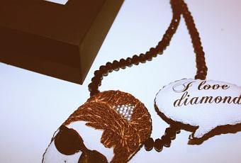 Et c'est précisément en fouillant dans cette jolie boutique que je suis tombée nez à nez avec LE collier le plus incroyable de l'année ! A l'effigie de Dita, Lady Gaga, Karl, Jackie, Anna Wintour, les créations de Marie-Rose faites à la main et dont les détails sont minutieusement cousus reprennent avec beaucoup de talent et de créativité les frimousses de personnages emblématiques. La chaine quant à elle est faite de perles noires et affiche aussi fièrement une bulle où est inscrite une phrase qui représente la personnalité qui figure sur le collier.