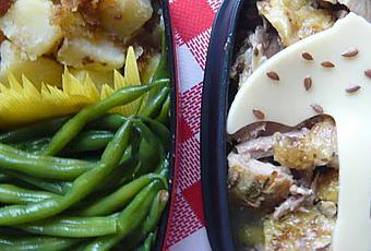 -reste de poulet rôti au four à l'ail, citron et herbes de provence, avec plein de sauce dans le fond qui était délicieuse à réchauffer (de la veille aussi, j'ai simplement enlevé la viande d'une cuisse le matin)