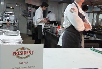 Pascal Barbot utilise-t-il habituellement des produits Président dans son restaurant? Sur la photo, il a l’air très à l’aise avec le logo de son sponsor sur sa tenue de travail. Moi qui croyait naïvement que les grands chefs ne travaillaient qu’avec de petits producteurs locaux, des artisans, amoureux de leur travail et de leurs produits. Il faut croire qu’aider un leader européen des produits laitiers à s’implanter en Chine vaut bien un fromage, sans doute…